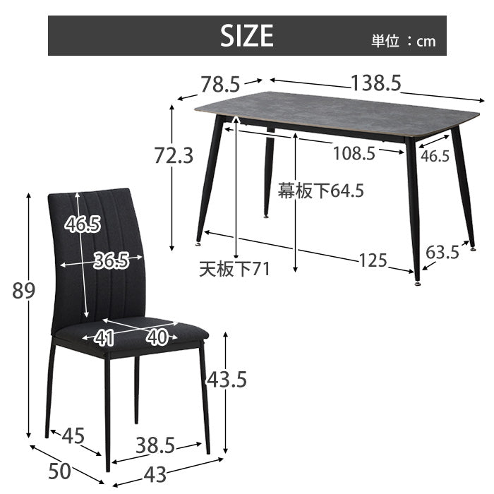 | テーブル:幅138.5×奥行78.5×高さ72.3cm チェア:幅43×奥行50×高さ89×座面高43.5cm |
